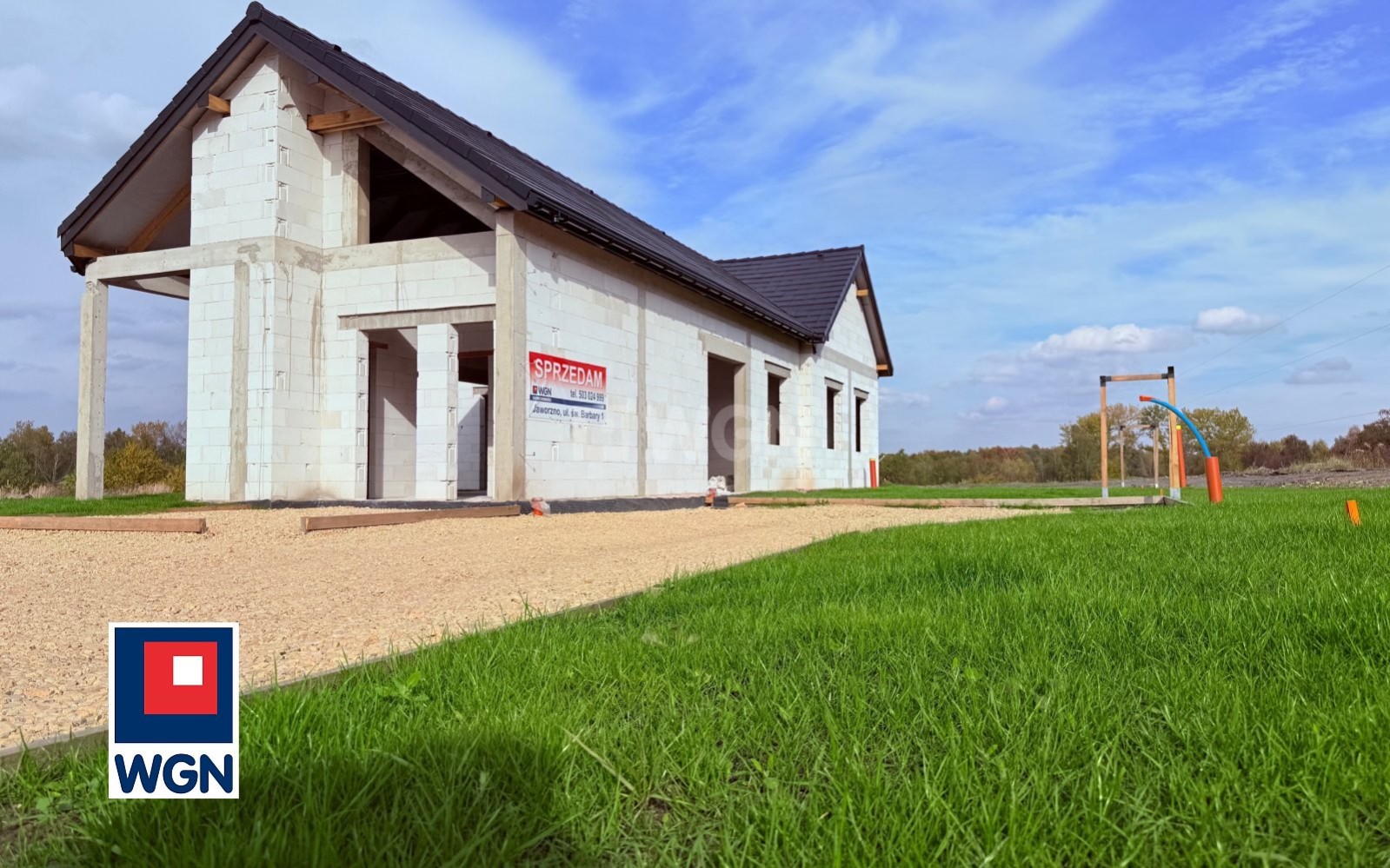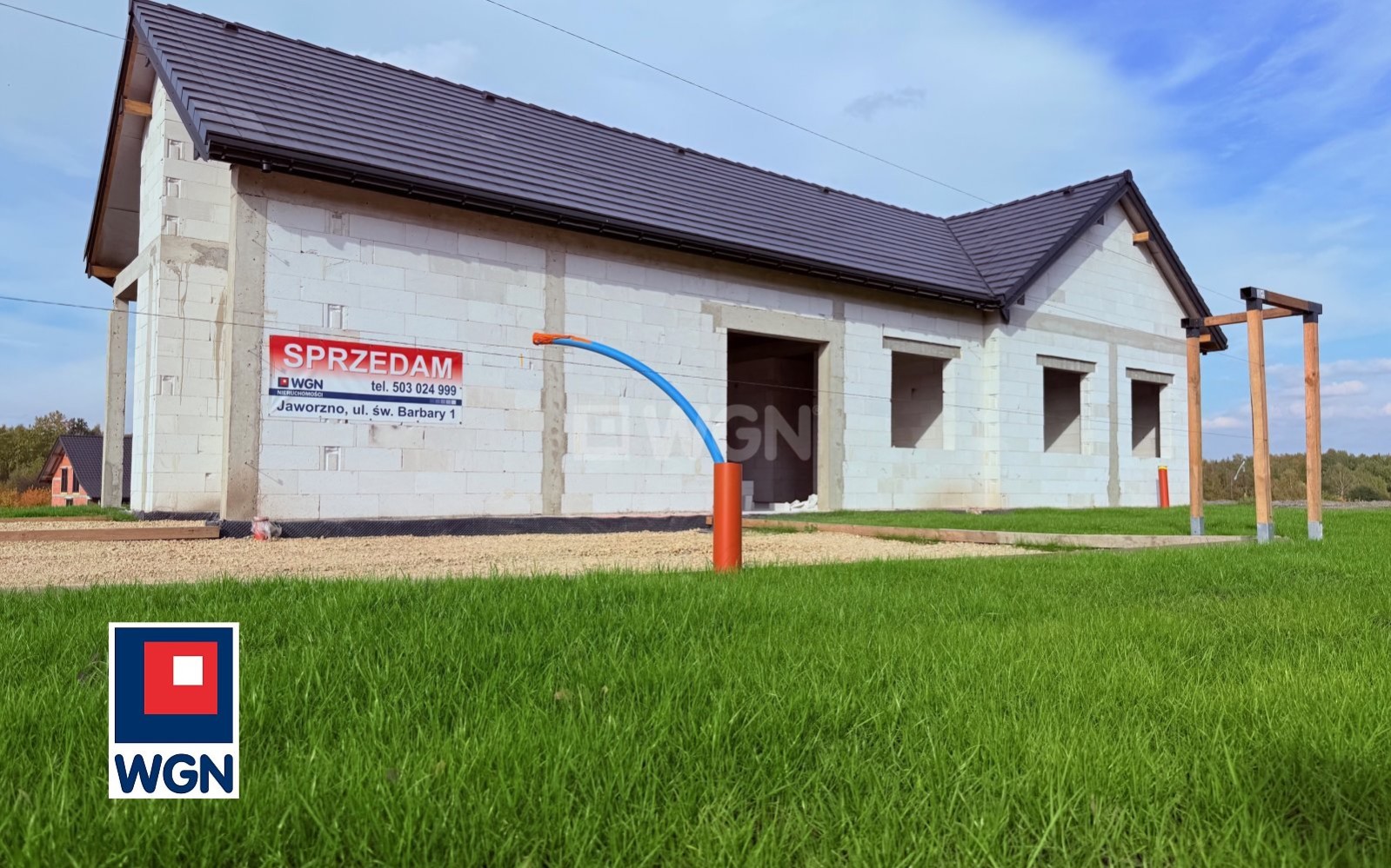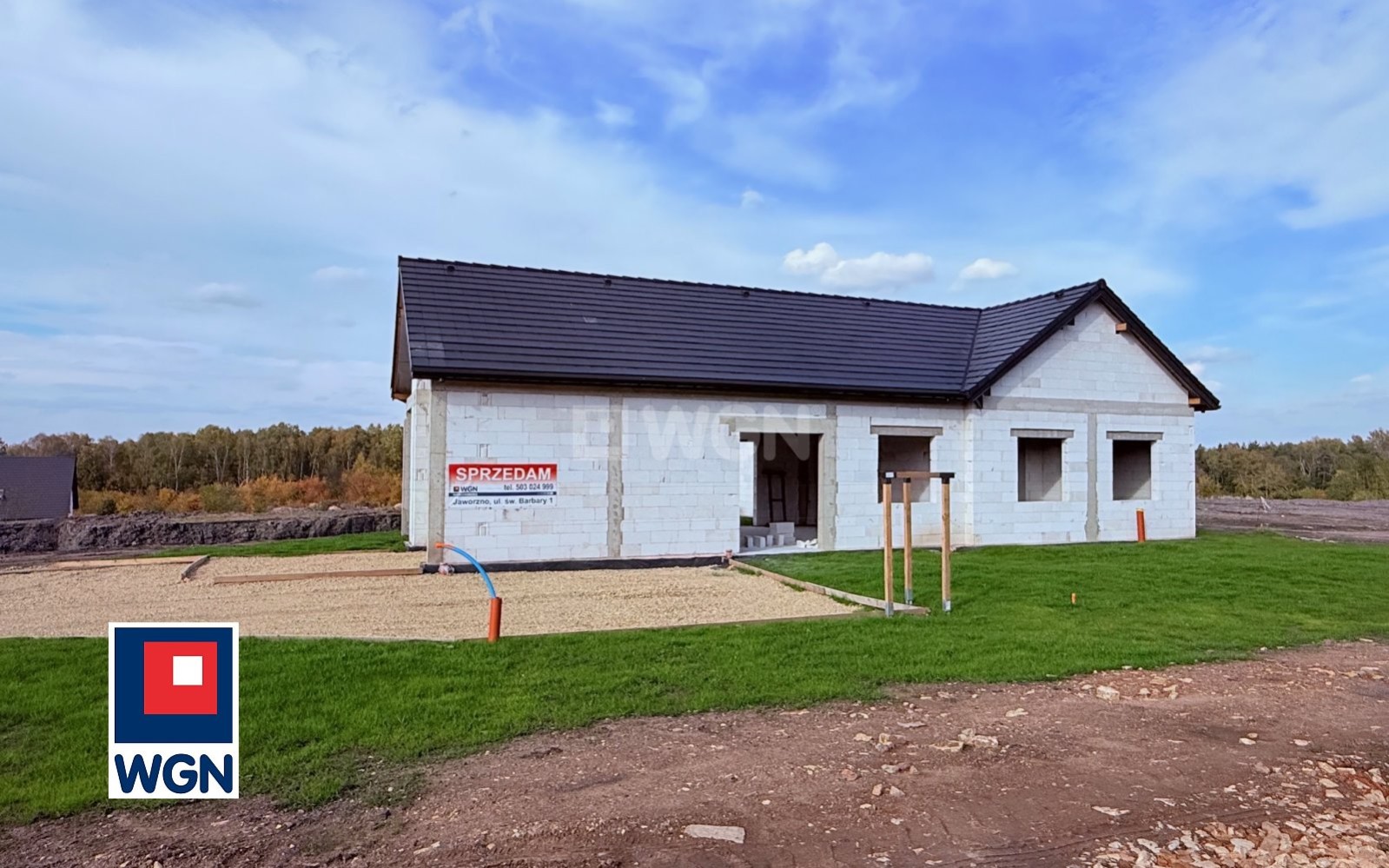 Na sprzedaż nowy, parterowy dom jednorodzinny w stanie surowym otwartym, położony w atrakcyjnej lokalizacji tj. w cichej i zielonej części Jaworzna - Dabrowa Narodowa, ul. Dubiela.